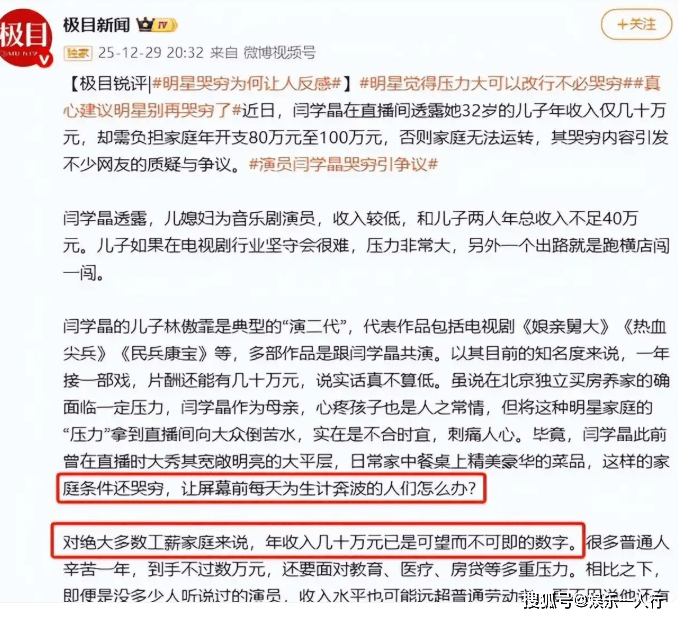 闫学晶这事儿得从2025年12月29日那场直播说起。 当时她穿着PRADA外套,戴着劳力士手表,对着360万粉丝叹气:“我儿子拍戏一年才挣二三十万,儿媳妇搞音乐剧不到十万,北京这地方啊...没个百八十万真活不下去。 ”弹幕当时就炸了! 有人翻出她北京朝阳区的豪宅照片——178平大平层,推开窗就是奥森公园,光是衣帽间就顶普通人三间卧室! 更狠的是,她去年一场直播带货报价12万,三条广告就能赚够儿子“一年开销”。 网友直接炸
