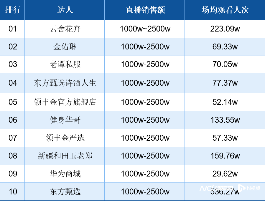 抖音2月10日直播带货日榜:前十直播间销售额均突破1000万,云舍花卉位列第一;东方甄选大号及矩阵号诗酒人生双双入榜。